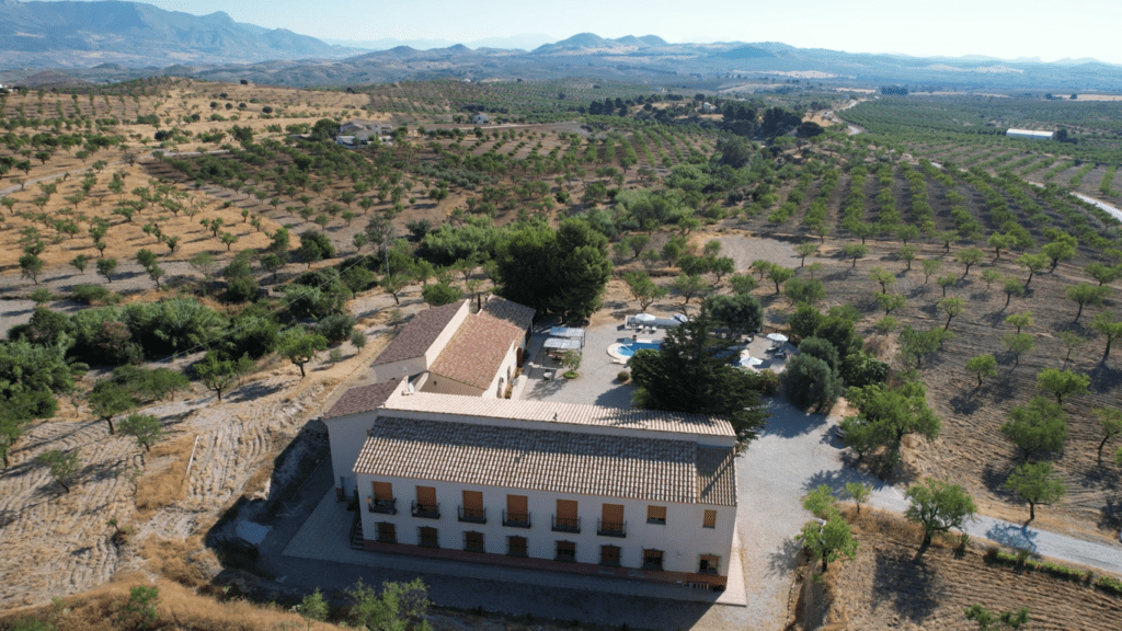 There is an outdoor seating area on the first floor with views of the Mahimon and La Muela mountains and surrounding countryside.